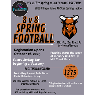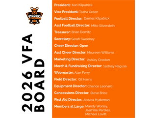 Villages Football Association (VFA) is a youth football and cheerleading organization. Our organization is dedicated to offering football and cheerleading to all youth between the ages of 5 and 14 in the World Golf Village, Palencia, and Nocatee areas of St. John's County, Florida. Our mission is to develop sound young men and women who will be the leaders of tomorrow. Our coaches are dedicated to teaching the fundamentals of teamwork and good sportsmanship through football and cheerleading.